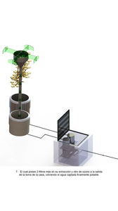 El proceso de filtración con carbono activado es crucial para garantizar que el agua de lluvia, recogida por la estructura, sea segura y limpia para su uso. El carbono activado tiene una gran capacidad de adsorción, lo que significa que puede atrapar impurezas, contaminantes orgánicos y olores presentes en el agua. En el contexto del proyecto ÁRBOLES VITA, el agua de lluvia que es captada por las "hojas" de la estructura es canalizada hacia un tanque de almacenamiento. Este tanque está equipado con filtros de carbono activado, que han sido fabricados a partir de barriles de aluminio reutilizados, donados por la empresa Valmorca. Estos barriles, tras ser acondicionados, sirven como base para los filtros, añadiendo un componente de sostenibilidad al proyecto al reutilizar materiales industriales.